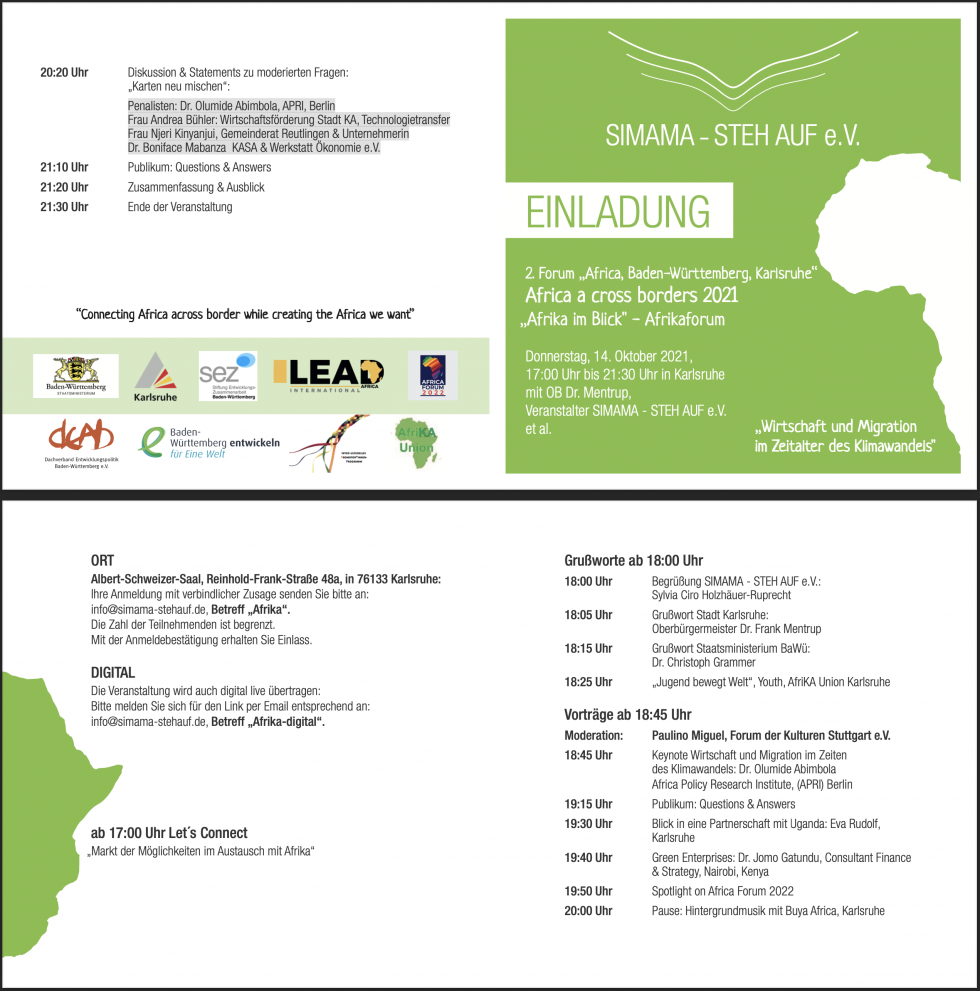 Das Forum „Africa across borders“ bietet in 2021 zum 2. Mal die Plattform für Akteuer*innen aus Politik, Unternehmen und Zivilgesellschaft. Mit den Kompetenzen der Menschen aus Diaspora, NGOs, Verwaltung und Wirtschaft werden neue Formen erfolgreicher Zusammenarbeit zwischen Afrika, Baden-Württemberg, Karlsruhe und Umgebung geschaffen.