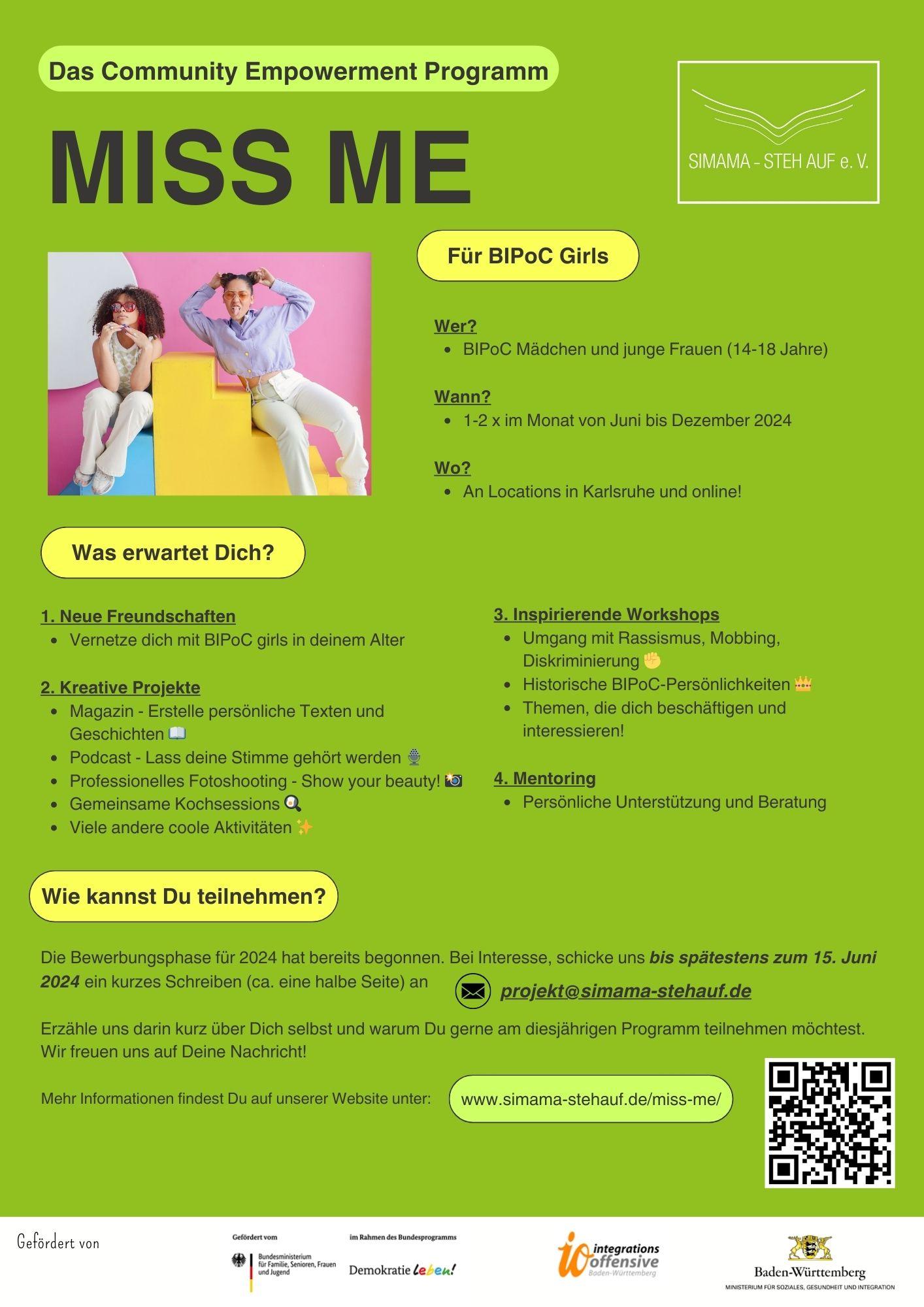 Die Miss Me Empowerment Academy ist eine Initiative von SIMAMA-STEH AUF e.V. für B(I)PoC Mädchen im Raum Karlsruhe, gegründet im Jahr 2021. Durch monatliche Treffen tauschen sich die Teilnehmerinnen des Programms über Identität und kulturelle Vielfalt, Selbstliebe, sowie gesellschaftspolitische Themen aus, die sie persönlich betreffen und die für ihre individuelle Entwicklung von Bedeutung sind. Diese regelmäßigen Diskussionen ermöglichen es den Mädchen, ihre eigenen Erfahrungen in einer weißen Mehrheitsgesellschaft zu reflektieren und sich mit dem Umgang verschiedener Formen der Diskriminierung auseinanderzusetzen. Durch kreative Gruppenprojekte wie Podcast-Aufnahmen, Poetry-Slams, Fotoshootings, und gemeinsame Kochworkshops, erhalten die Jugendlichen die Möglichkeit, ihre Kreativität zu entfalten, neue Freundschaften zu schließen, und gleichzeitig praktische Fähigkeiten für ihre zukünftige Entwicklung zu erlangen.